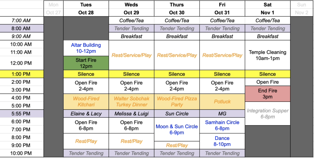 Our dinner traditions are in tact: 10/28 Wood-Fired Kitchari with Pasta Mel , 10/29 Walter Sobchak Transformation Turkey Dinner by Jessica, 10/30Wood-fired pizza at the Cosmic Egg with Beana, and 10/31 will be Samhain Ancestor Potluck Feast. We’ll make an offerenda at Grandma Maple for the ancestors too!
